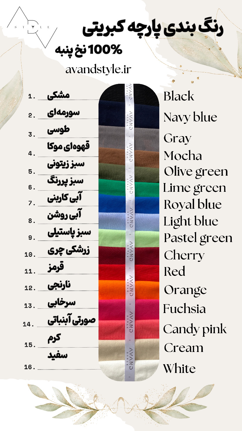 مشخصات اصلیرنگ / سفید / مشکی / کرم / سورمهای / زرشکی / سرخابی / آبی روشن / آبی کاربنی / سبز زیتونی / سبز سیدی / سبز پاستیلی / صورتی پاستلی / لیمویی / قهوهای تیره / نسکافهایسایز / 34 / 36 / 38 / 40 / 42 / 44 / 46 / 48 / 50مشخصات فرعیجنس پارچهکبریتی ۱۰۰٪ نخ پنبه گرم بالا